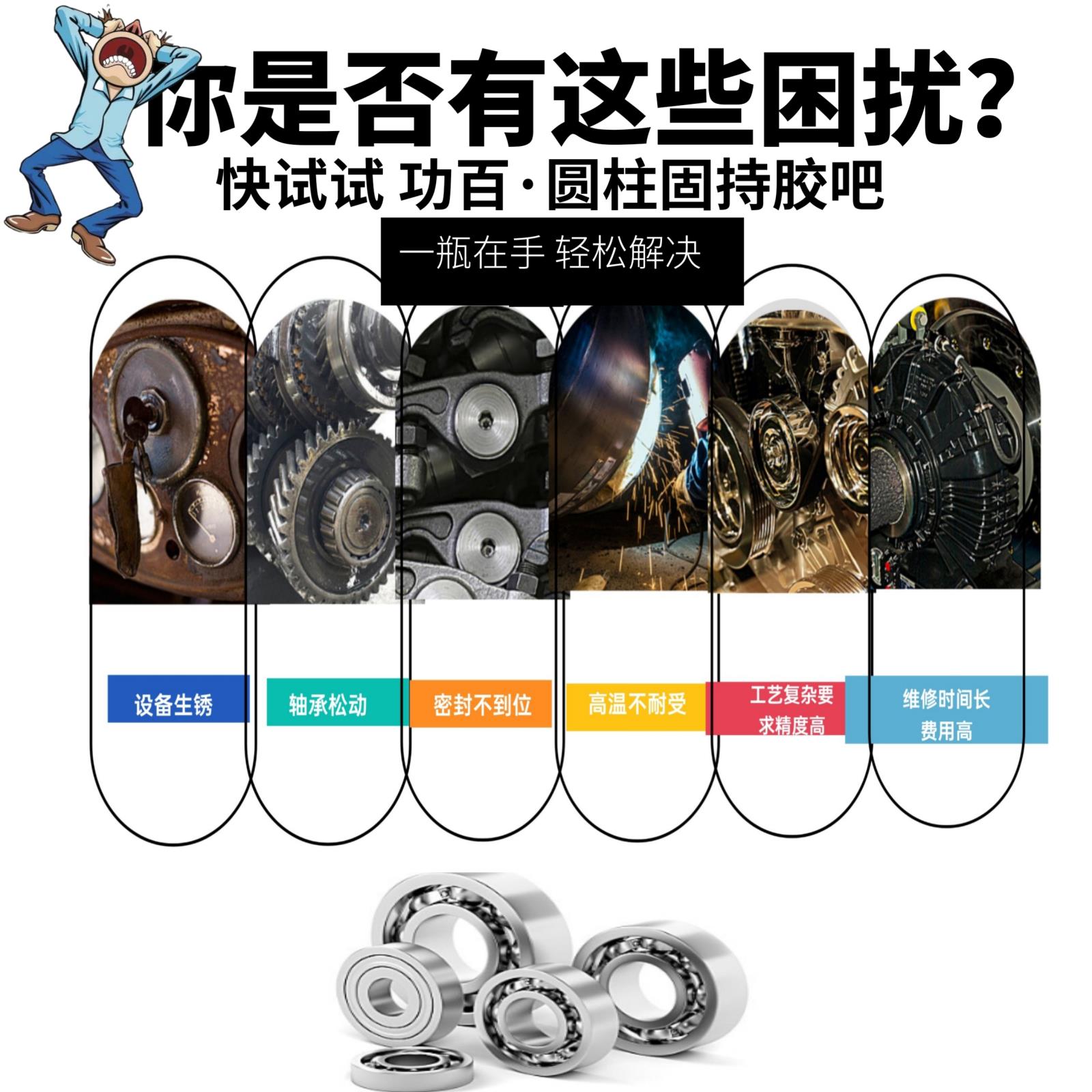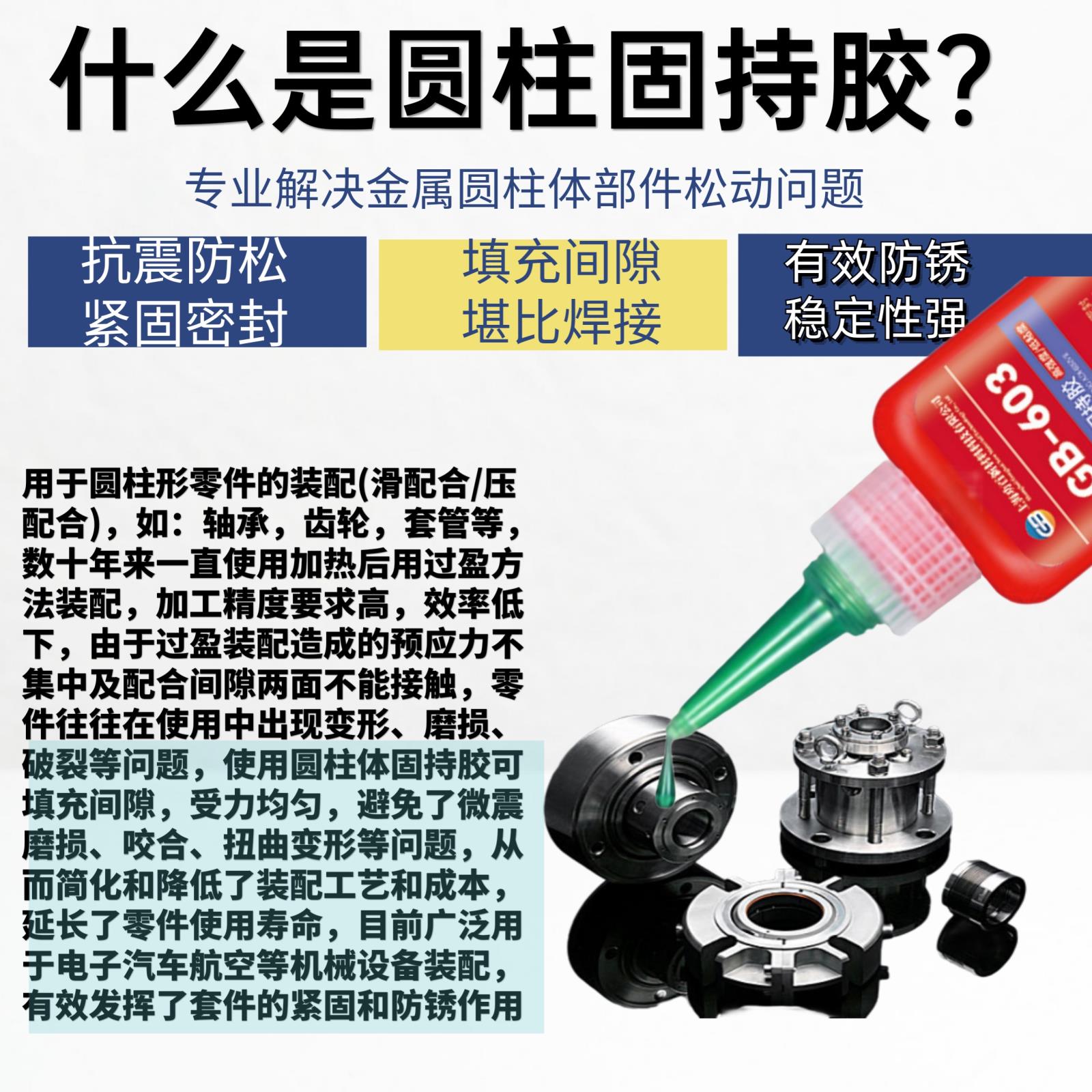 应用类型:圆柱型装配零件的粘接作业,尤其适用于粘接最大间隙0.13以及需要在室温条件下该到最大强度的应用作业。