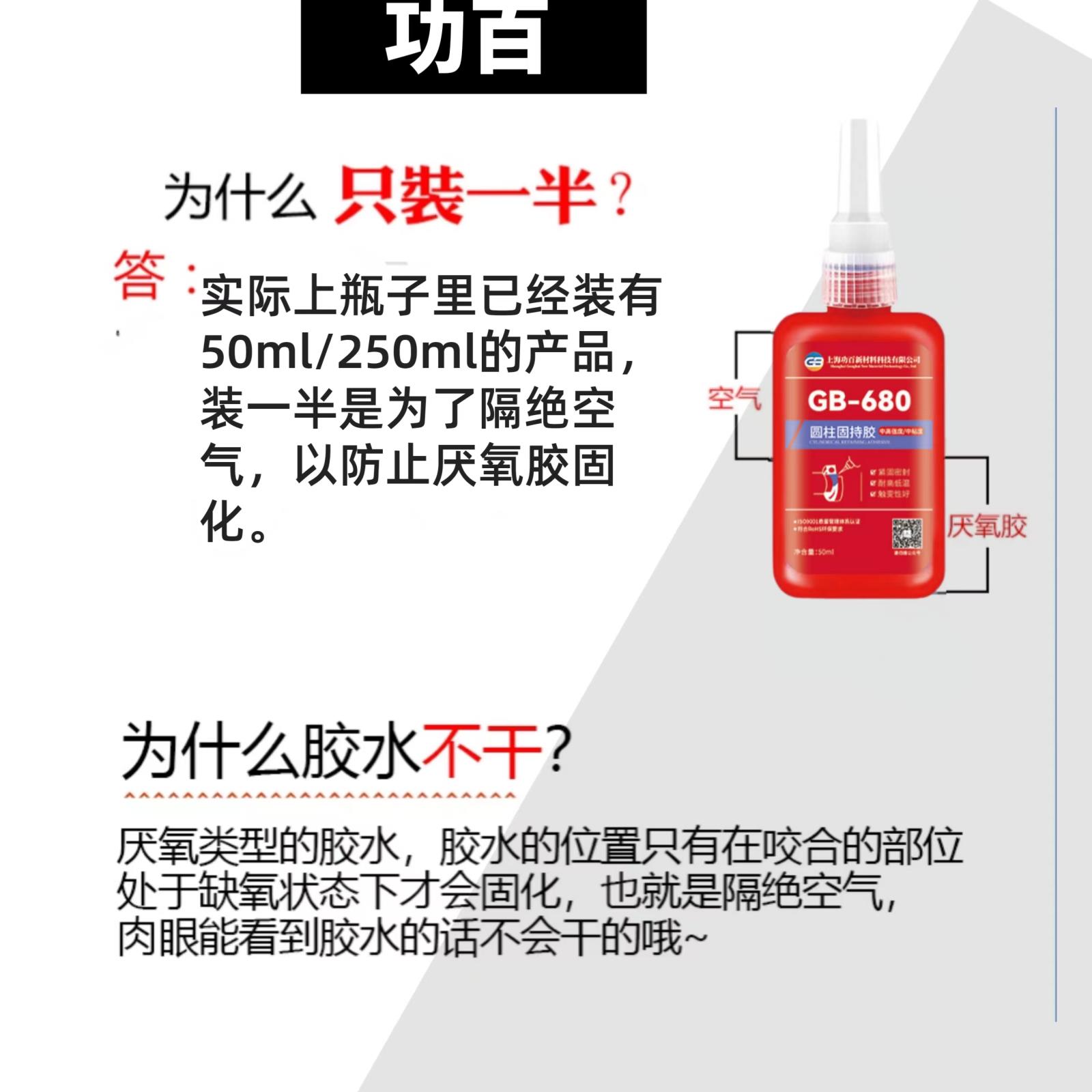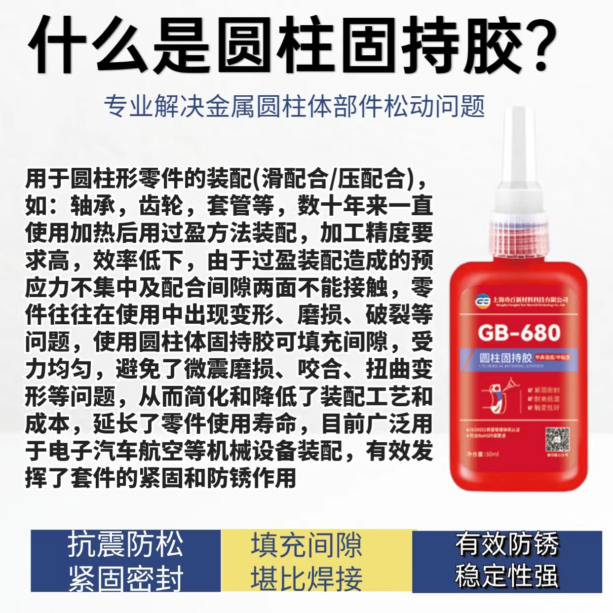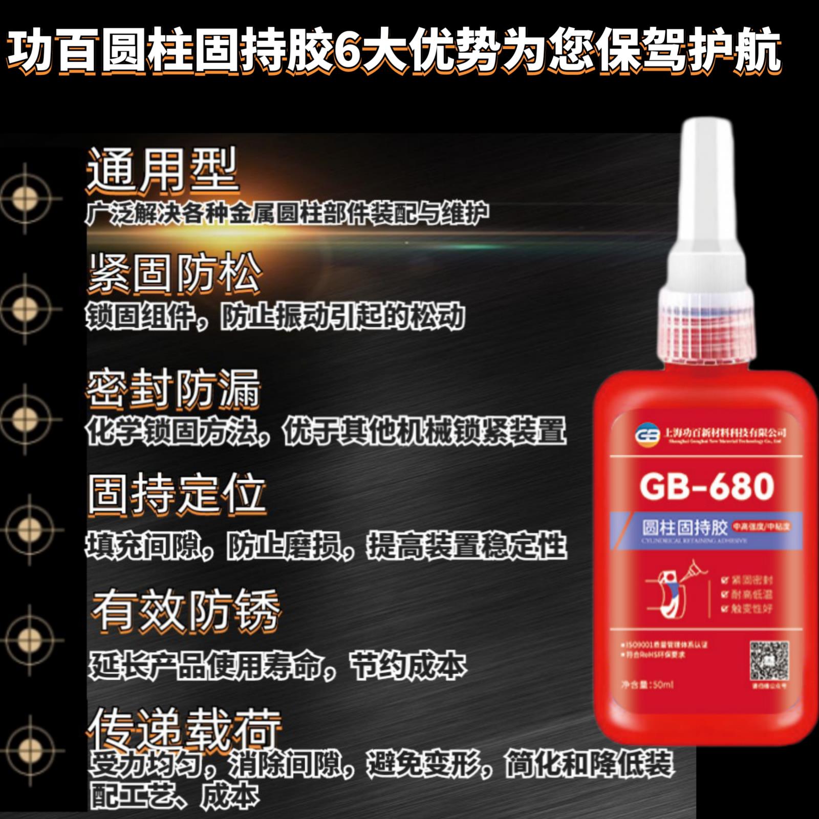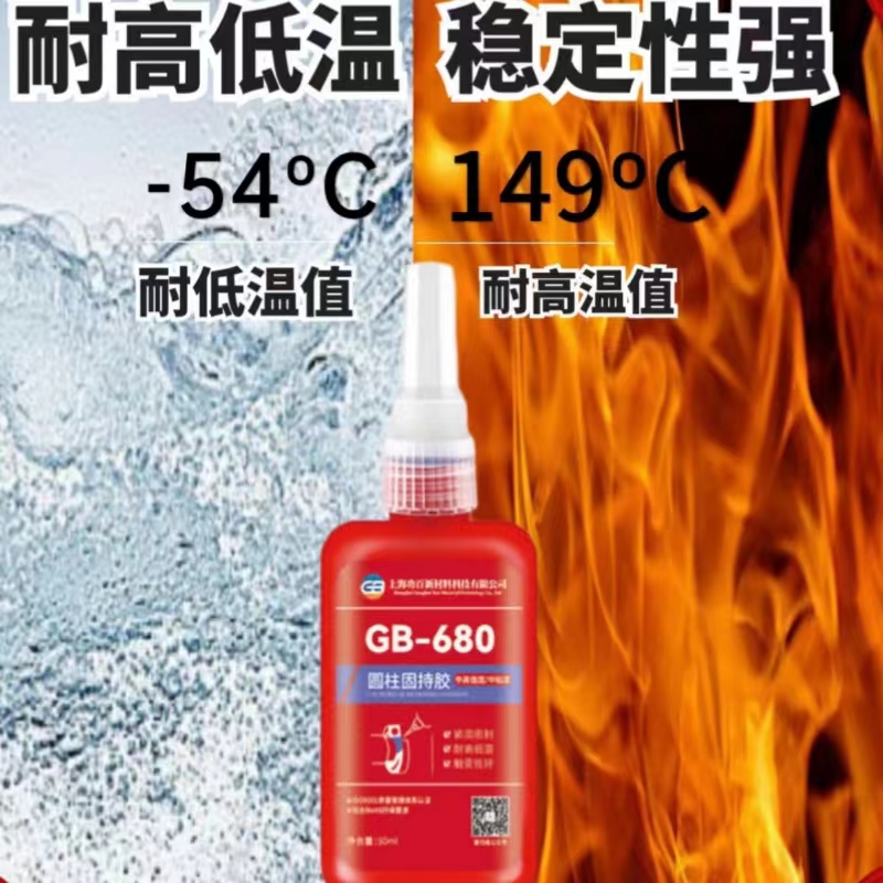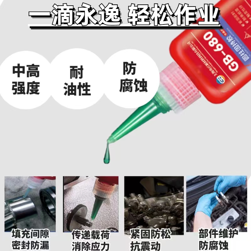 GB-680通用型/高强度圆柱固持胶,单组份、高强度、通用型、中粘度的厌氧型圆柱体孔/轴配合件固持胶。本胶在两个紧密配合的金属之间与空气隔绝时固化。