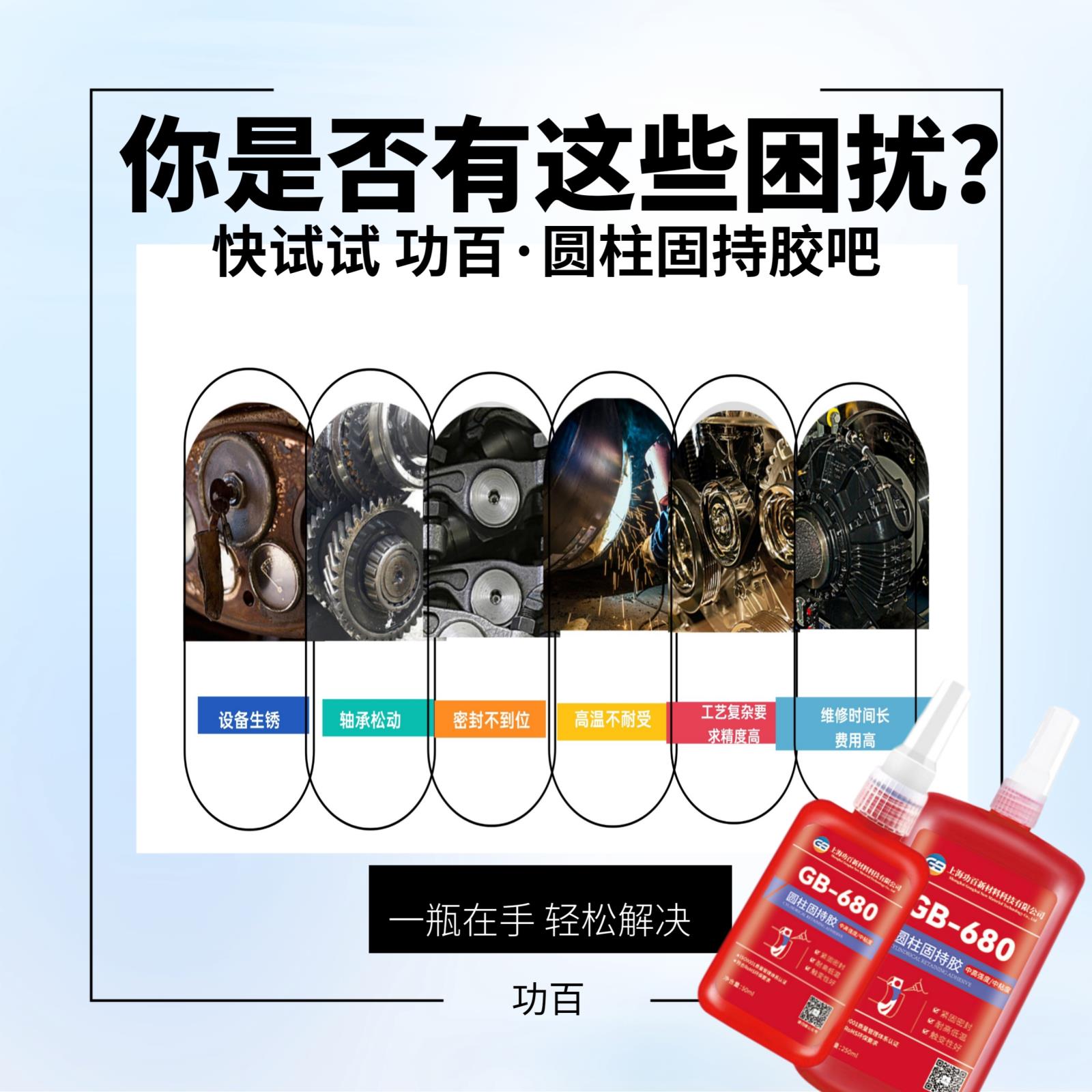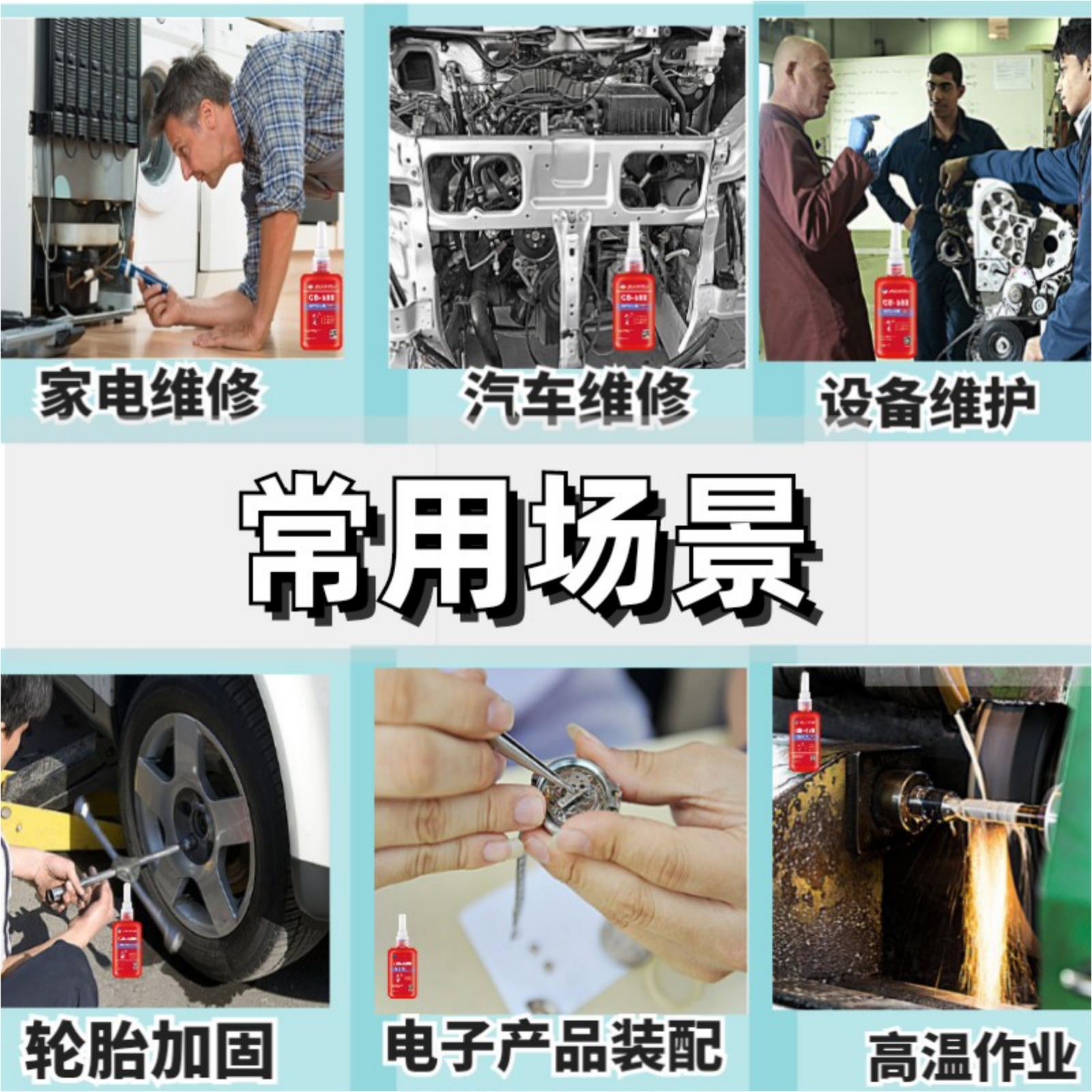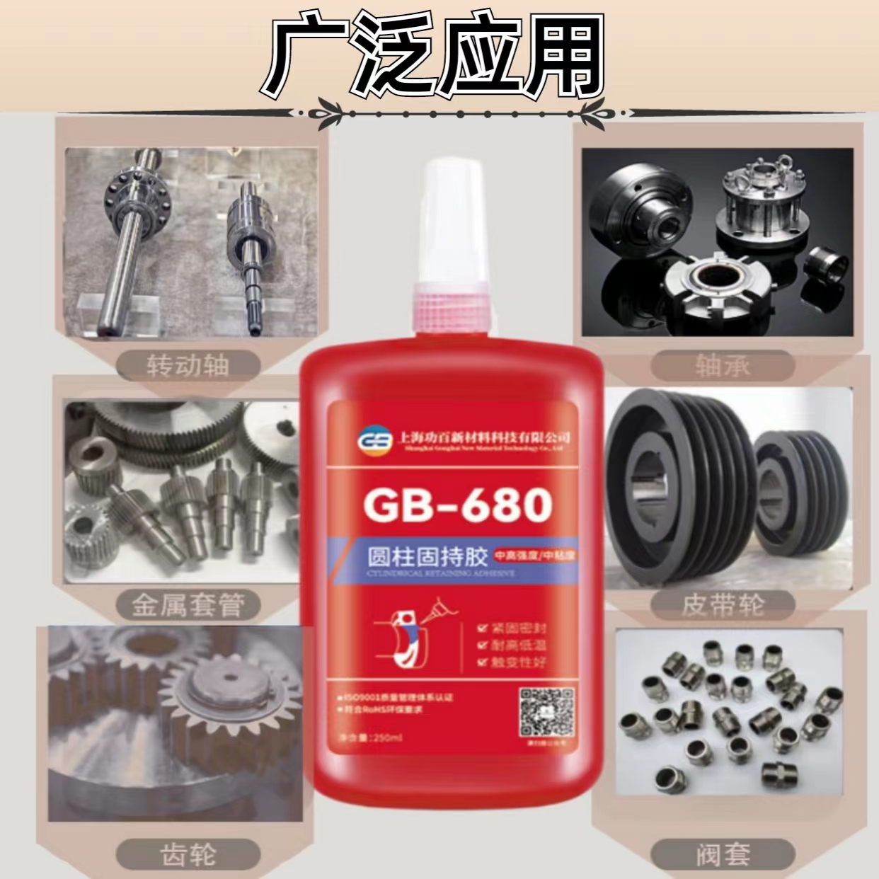 典型用途:圆柱固持胶适用于径向间隙≤0.25mm 的间隙配合或过渡配合,最佳配合间隙0.05~0.10mm。可取代压配合,防锈蚀。典型用途:轻微磨损轴承、轴套等装配,固持皮带轮、套管、齿轮、转子、修复孔—轴配合件及超差零件。